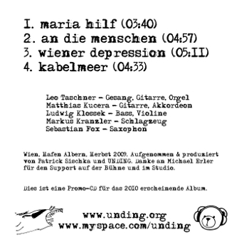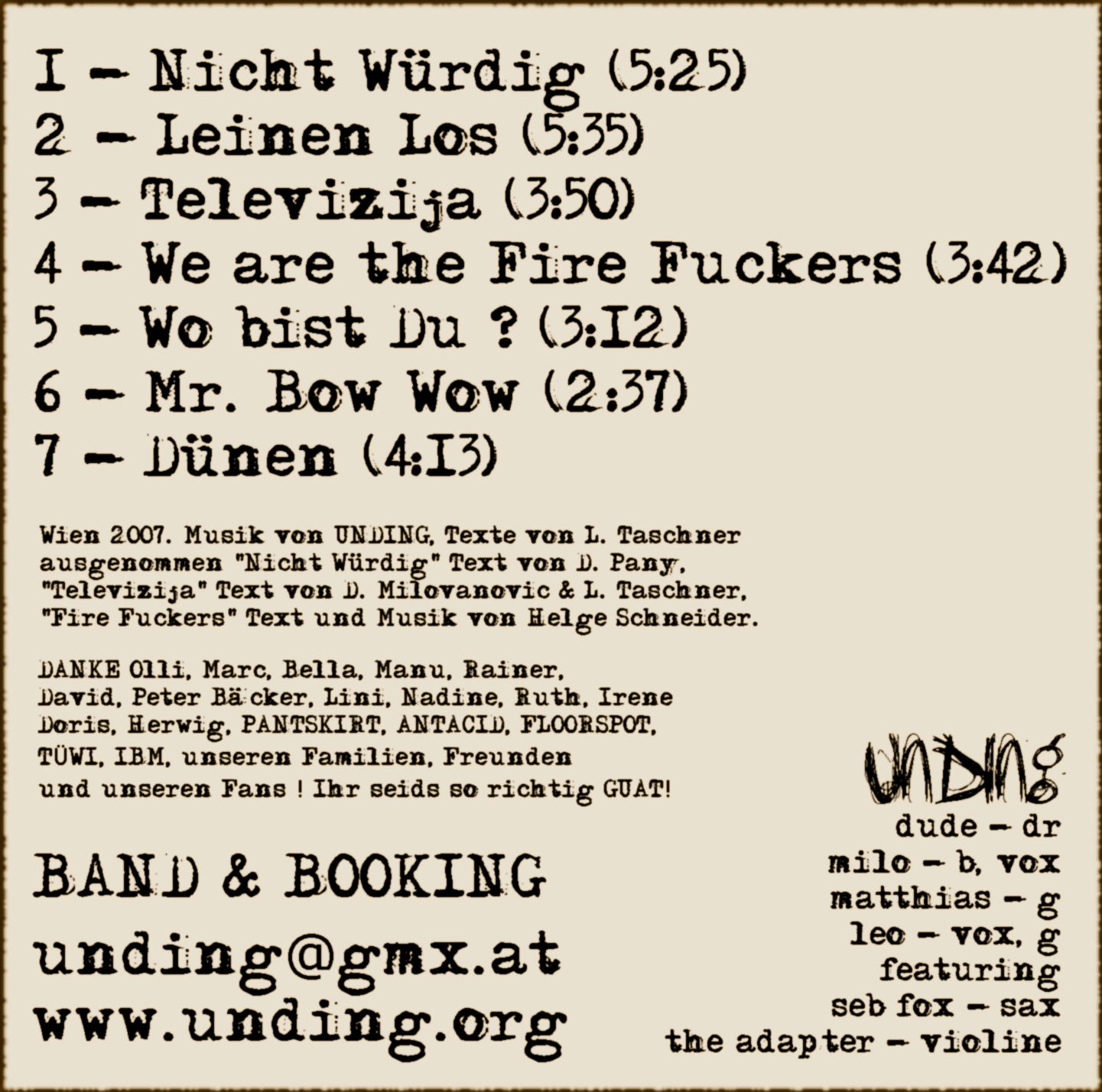 Free Download Album 1 - NICHT WÜRDIG download 2 - LEINEN LOS download 3 - TELEVIZIJA download 4 - WE ARE THE FIRE FUCKERS download 5 - WO BIST DU? download 6 - MR. BOW WOW download 7 - DÜNEN download Hier kannst Du die komplette 7DRECKSDEMO runterladen. Der Großteil der Songs wurde 2007 bei einem Live-Gig im Wiener Türkenwirt aufgenommen. UNDING featuring Milo - Bass, Seb Fox - Saxophone Viel Spass!